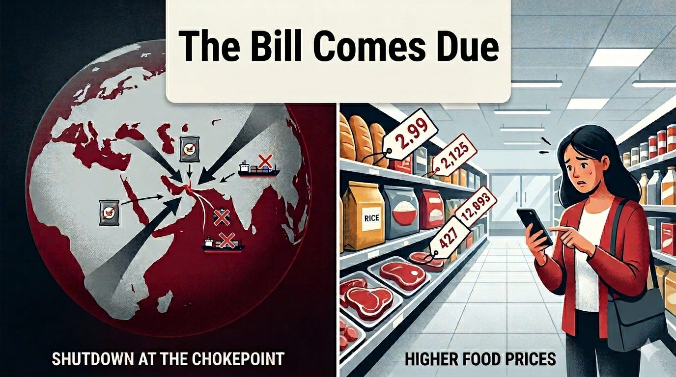 The U.S.-Israeli war with Iran, which began on February 28, 2026, has effectively shut down the Strait of Hormuz — a narrow passage between the Persian Gulf and the Gulf of Oman that most Americans couldn’t find on a map if their lives depended on it. But here’s the thing: what happens there is going to affect what you pay for food for months, possibly years, to come. And depending on where you live in the world, it could mean something far worse than a higher grocery bill.